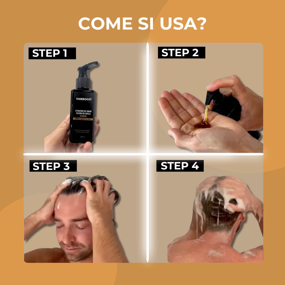 Per risultati ottimali, utilizzare lo shampoo Hairboost come parte della propria routine di cura dei capelli, andrà a sostituire lo shampoo che utilizzi normalmente.